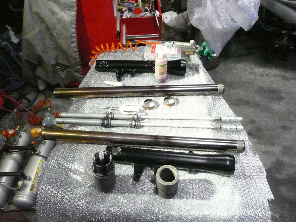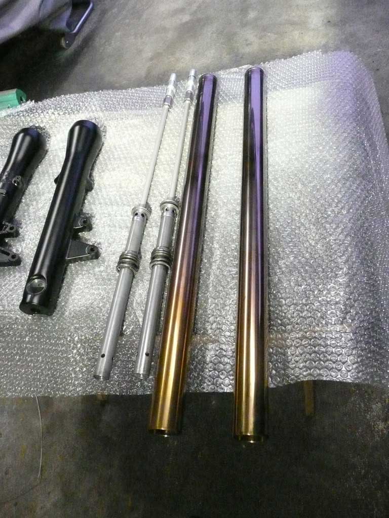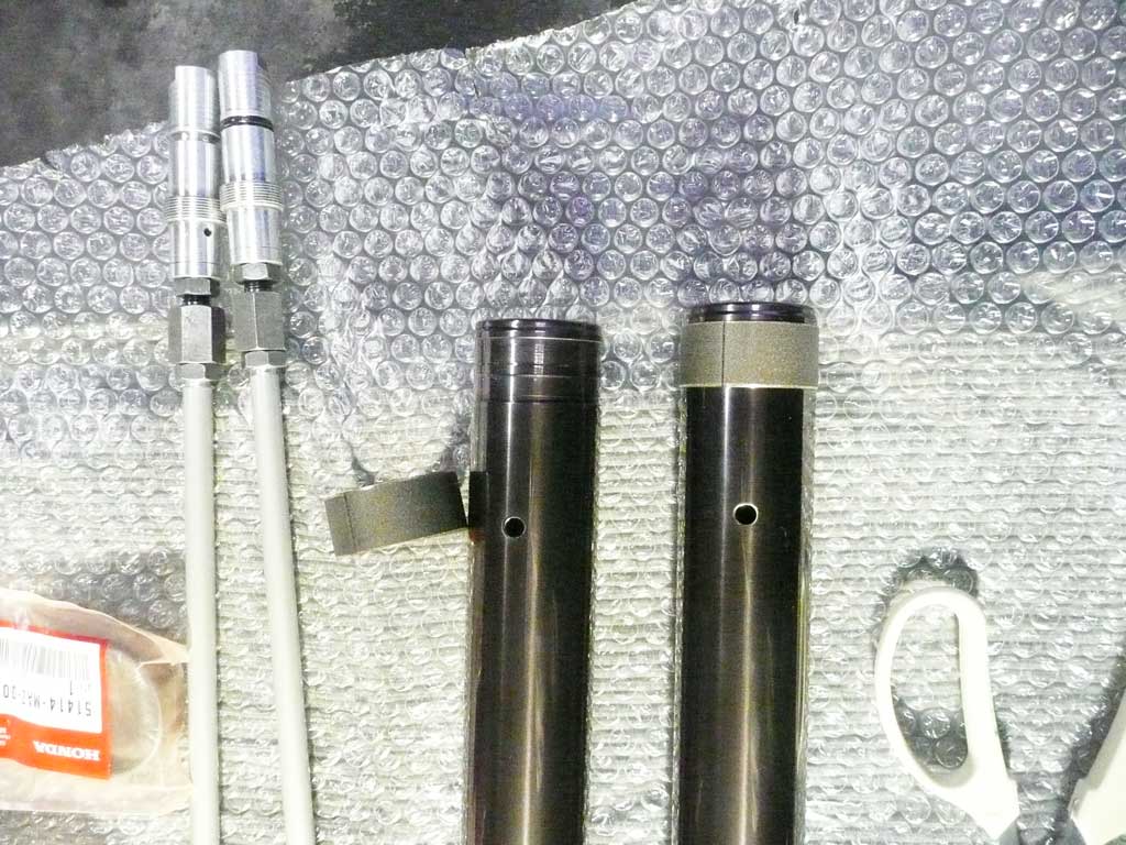 X4のフォークでダンピング調整が可能で、 X4純正よりも短く、SC54純正よりも長くて メッキとチタンで見た目もCOOLなヤツを作ってくれとの オーダーを受けましたので 6ヶ月の歳月を掛けてフロントフォークが完成しました。 ↑ インナーチューブは、SC54用です 円筒研削を施し、再メッキとバフ掛け、イオンプレーティングを2回施工した高級品です。 アウターチューブは、メッキ後、内部壁を規定寸法に収まるようバフ掛けし、ツルツルにした これもスペシャル品です。 スライドメタルです。 表面は、テフロンコートです。 ↑オイルシールドライバ ↑ 左の錘をスライドさせて、メタルとシールを挿入します。 ↑ 仮組 下がメッキで、上が光沢のあるガンメタリック色なので 見た目が、とても、クールです。 ↑ 内部はカートリッジ方式に変更してあります。 ダンピングとスプリングセット加重を変更できるようになっています。 また、カートリッジロッドもテフロン加工を施してあります。 オイルシールは、三元共重合体ニトリルゴム(XNBR)を使用した、スペシャルシールです。 トップキャップは、黒アルマイトを施しました。 総費用はオーリンズ正立フォーク2本分ぐらいでしょうか・・・・・・・ はっきり言って、自分が使いたいくらい、かっこいいです。