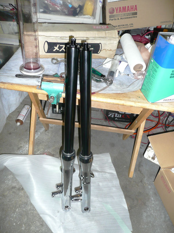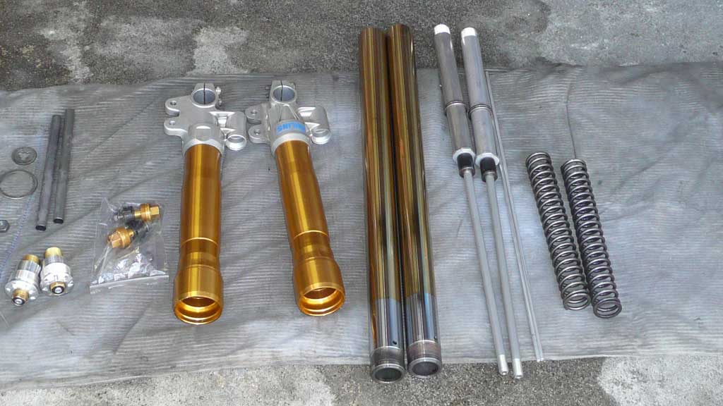 X4のフォークでダンピング調整が可能で、 X4純正よりも短く、SC54純正よりも長くて メッキとチタンで見た目もCOOLなヤツを作ってくれとの オーダーを受けましたので 6ヶ月の歳月を掛けてフロントフォークが完成しました。 ↑ インナーチューブは、SC54用です 円筒研削を施し、再メッキとバフ掛け、イオンプレーティングを2回施工した高級品です。 アウターチューブは、メッキ後、内部壁を規定寸法に収まるようバフ掛けし、ツルツルにした これもスペシャル品です。 スライドメタルです。 表面は、テフロンコートです。 ↑オイルシールドライバ ↑ 左の錘をスライドさせて、メタルとシールを挿入します。 ↑ 仮組 下がメッキで、上が光沢のあるガンメタリック色なので 見た目が、とても、クールです。 ↑ 内部はカートリッジ方式に変更してあります。 ダンピングとスプリングセット加重を変更できるようになっています。 また、カートリッジロッドもテフロン加工を施してあります。 オイルシールは、三元共重合体ニトリルゴム(XNBR)を使用した、スペシャルシールです。 トップキャップは、黒アルマイトを施しました。 総費用はオーリンズ正立フォーク2本分ぐらいでしょうか・・・・・・・ はっきり言って、自分が使いたいくらい、かっこいいです。