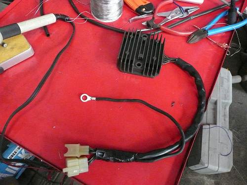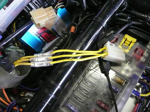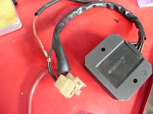走行時の電圧が15.0Vまで上昇し、なんか問題ある風でしたが 結果としては、15Vあって正解です まず、車載機器は13.8V±15%で設計されていますので 15Vまで上昇しても問題なしです。 問題あるのは、自作機器 特にLED点灯回路を抵抗で電流制限している場合に 余裕をみて設計してない回路で、電圧上昇時にLED素子が 破壊されるときがあります。 実は、追加メーターのLED照明を12.0Vで設計したたため 壊れてしまいました。 CRDで電流制御にするか、 3端子レギュレーターで電圧制御をするべきですね。 また、3相発電機回路の250コネクターの発熱は相変わらずなので ここの、発熱発火事故を防止するには、直結または端子数を増やし 電流容量を上げるしか方法はありません。 過走行車をお持ちの方は、一度点検してみることをお勧めします。 茶色くなってたら、交換時期です。 はっきり言って、X4のハーネス設計は、×です。 さて、レギュレーターレクチファイヤーの高効率処理も終わって 加熱変色した3相発電機回路(車体側)です 黄色いケーブルが、変色して茶色いケーブルになってます。 この原因は、コネクターコンタクトの断面積がケーブルよりも小さい為 その部分で発熱し、ケーブル皮膜を炭化させる程に発熱したものです。 また、導体部分も加熱により、酸化皮膜が形成されております このまま放置すれば、接点抵抗が次第に増加し、発熱量が増え、いずれ発火事故に繋がります。 走行風が当たる場所であれば冷却されますが、シート下では冷却が期待できません。 走行風が当たる、発電機側のコネクターに加熱劣化は見られませんでした。 *新車より13,000キロ走行、ただし普通の車体より消費電力は多い。 この原因を取り除くには、ケーブルを直結するのが手っ取り早いですが 今回は新しいコネクターにして、様子をみます。 仕上げに接点復活剤をコネクターコンタクトに塗ります。 酸化皮膜を取り除き、形成を遅らせてくれます。 ホンダの二輪車でレギュレートレクチファイヤのコネクター加熱事故が多発しているようですが 原因は、コネクターコンタクトの酸化皮膜による接触抵抗増加による発熱が原因です。 レギュレートレクチファイヤ側の接地線を直接、接地してやることで コンタクト部分の電流量を減らして、発熱を解消します。 いわゆる、レギュレートレクチファイヤのアーシングです。 一般的にレギュレートレクチファイヤのボディにアース線をボンディングしますが ケースと内部部品が絶縁されてますので、効果はありません。 上記写真のように、緑黒線を直接接地してやります。 プラス側はコンタクト数を増やすか、バイパスを設けてやるとやると、発熱を解消できます。 250コネクター |